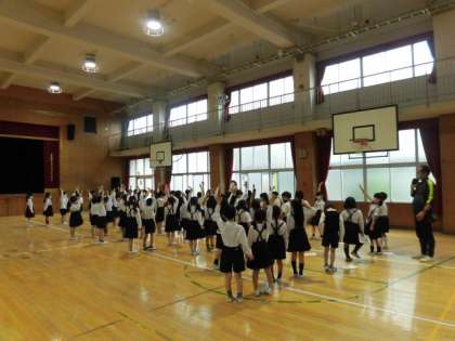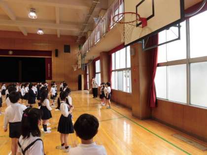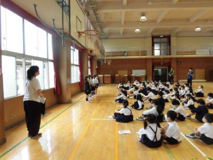 今日は、1,2年生による「みつや みつけ」たんけんの日です。それぞれの学年の1組、2組、3組で一緒に活動をします。最初に体育館に集合し、2年生の係の人の「みつや たんけん がんばるぞー」の掛け声で始まりました。