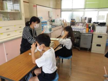 2年生は聴力検査です。ろうかでも、きっちりと整列をして、静かに待つことができていました。しっかりと聴くことができたかな?