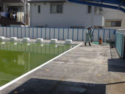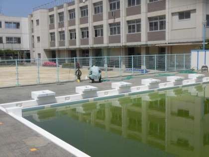 今日は朝から暑い中、一日中ずっと、管理作業員さんがプールの掃除をしてくれています。ありがとうございます!暑くなってきたので、プールの授業が楽しみです。