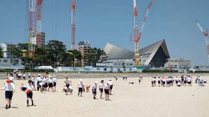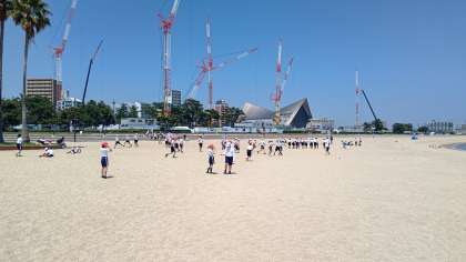 お弁当のあとは砂浜で学級遊びです。ちょっと走りにくいけど、広くて気持ちいい!