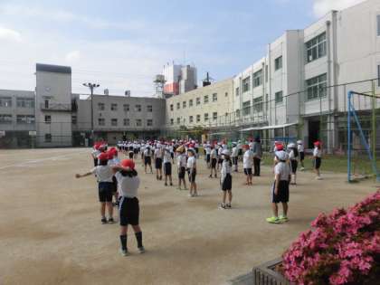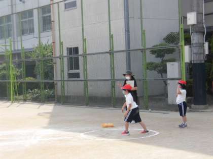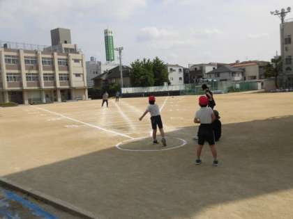 昨日の夕方にたくさんの先生で、ソフトボール投げの準備をしました。最初に、2年生がソフトボール投げをしました。