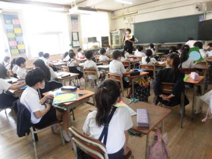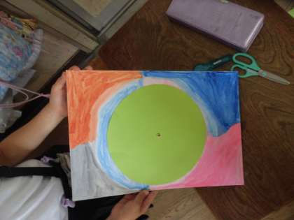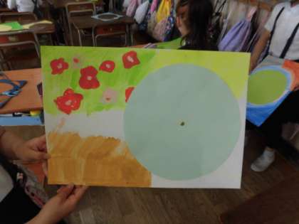 2組は図工です。自分で考えたテーマをもとに、回転する円を入れて作品をつくっています。完成が楽しみですね!