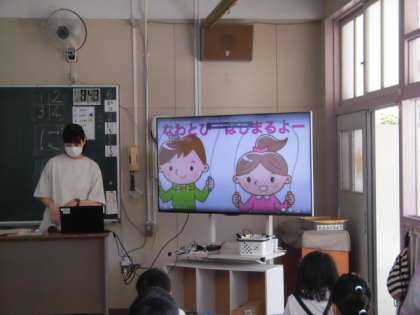 今日は運動委員会の人たちが作ってくれたリズムなわとびの動画をクラスごとに見ています。1年3組では、動画を見ながら一緒に手を動かしていました。がんばってたくさん練習しようね!