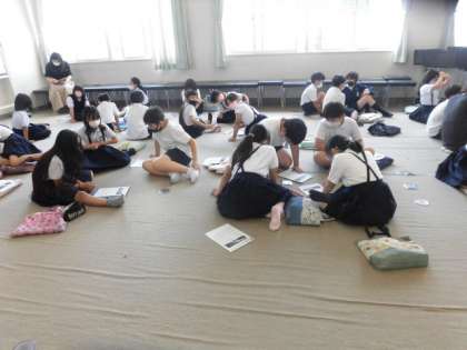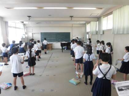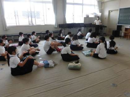今日は教育委員会からも先生に来ていただき、先生の研究授業がありました。「いつでもあの海は」の曲を上のパートと下のパートに分かれて歌いました。ハモるのはなかなか難しいですね。