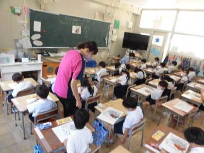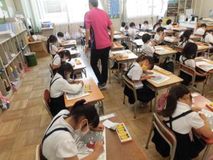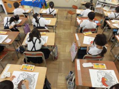 「どうぶつえんへいこう!」のテーマで、パスを使ってぞうやさい、くまの色を塗っていきます。王子動物園に行ってきたばかりなので、ぴったりの絵ですね!
