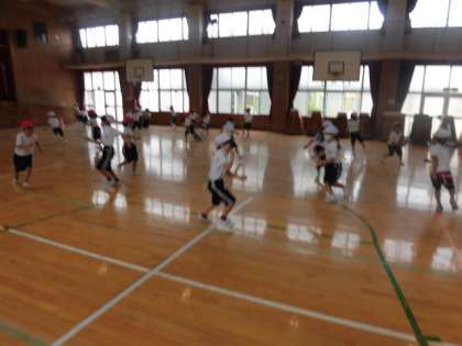 今日は体育館で「しっぽとり」ゲームをしています。みんな元気に走り回っています。