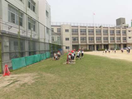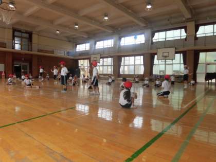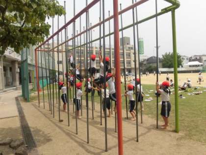 1組は体育館でなわとびのテストをしています。2組はなわとびと鉄棒をしています。3組はのぼり棒です。はだしでがんばっているので、上まで登れる人も増えてきました!