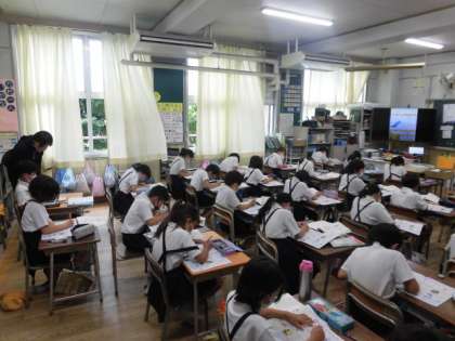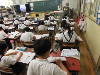 今日はローマ字の練習をしています。みんな真剣に書いています。