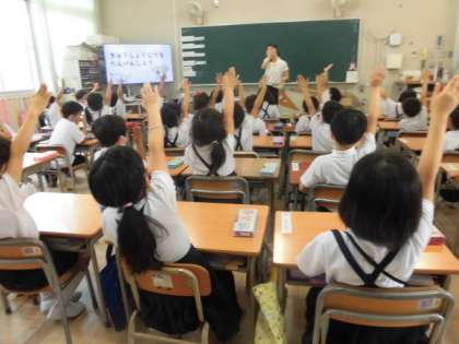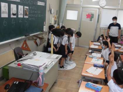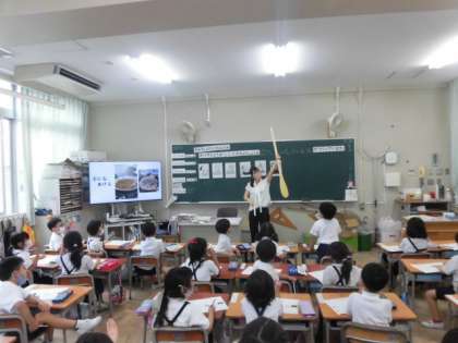 今日の5時間目は1組での研究授業です。給食について勉強しました。いつも給食調理員さんが、愛情いっぱいに給食を作ってくれていることを学びました。たくさんつくらないといけないので、道具がおうちで使っているものよりも、随分と大きいです。実際に使っている釜と同じ大きさの円に何人乗れるか試したところ、なんと15人も乗ることができました!