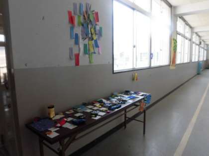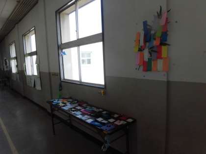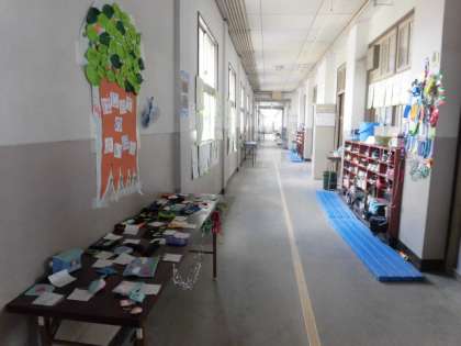 5年生の教室の前の廊下には初めての裁縫による作品が展示されています。七夕の願い事を書いた短冊も廊下に飾られています。願い事は何かな?