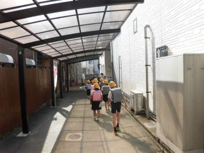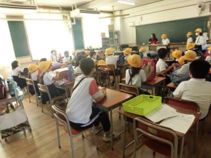 指示に従って、静かに順序正しく、地域ごとに集合し、避難します。素早くできるようにしっかりと覚えておこうね。