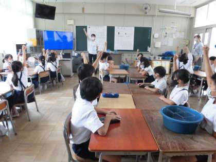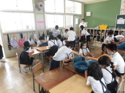 今日は2年生の研究授業です。リットルやデシリットルについて学習をしています。実際にLマスやdLマスを使って、どれくらいの量になるかを調べています。
