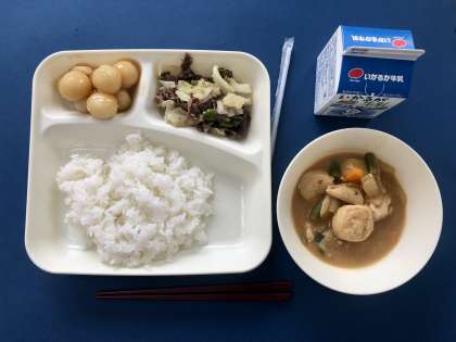今日の給食では、さといもを使った「一口がんもとさといものみそ煮」や、白玉団子を使った「みたらしだんご」が出ました。