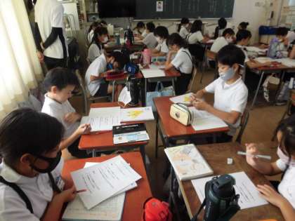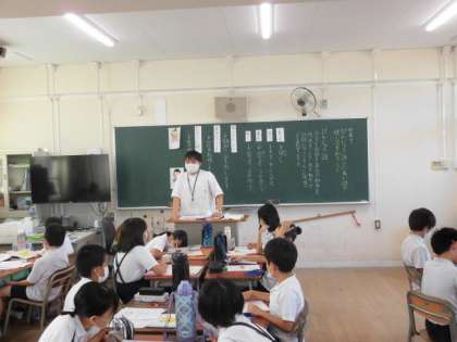 今日は教育実習生の授業です。謙譲語や丁寧語などの敬語について、学習をしています。場面に合わせて、実際に会話をしてもらいました。