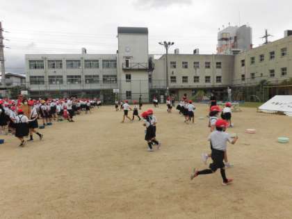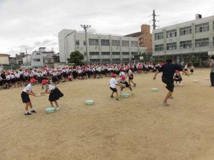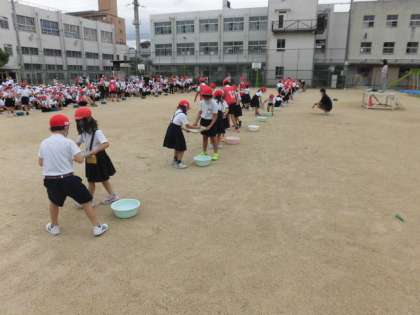 二人一組でお盆の上にカップをのせて、反対側にあるバケツの水をカップですくい、二人で協力して運んで、自分たちのバケツに水をためていくというゲームです。