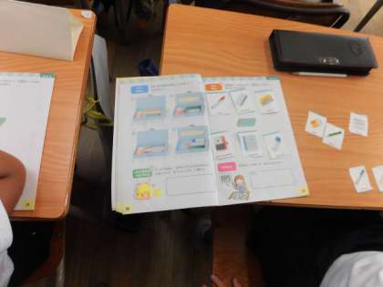 「文房具の絵カードを並べて文房具セットをつくり、友だちと伝え合おう」ということで、何を持っているかを英語で質問をし、答えています。