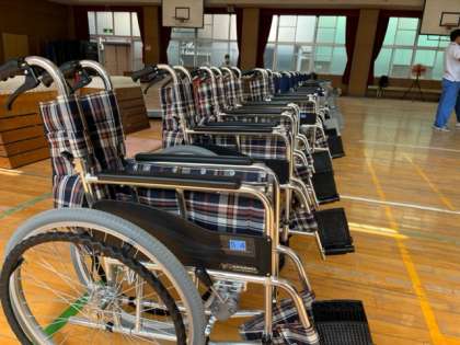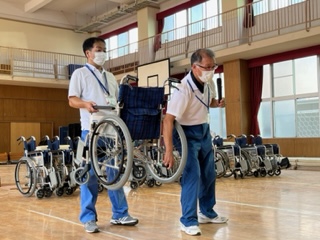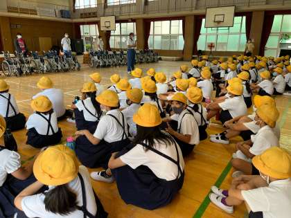 大阪市立心身障がい者リハビリテーションセンターから来ていただき、車いす体験学習をしています。