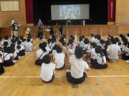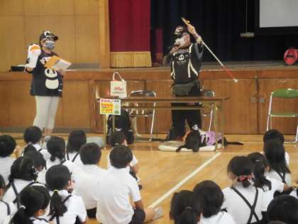 今日は地域の目の不自由な方が、お話をしに来てくださいました。どのような見え方であるかとか、盲導犬や白杖についてや、困ること、みんなにして欲しいことなどを話してくれました。特に信号がわかりにくいということで、青になった時に「青になった,渡ろう」などと隣でひとり言を言うだけでも助かるということでした。「視覚障がいは不便ではあるが、不幸ではない」といった言葉が心に残りました。みんなもまた、自分ができることを考えてみてくださいね。