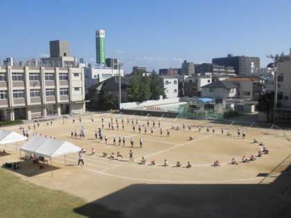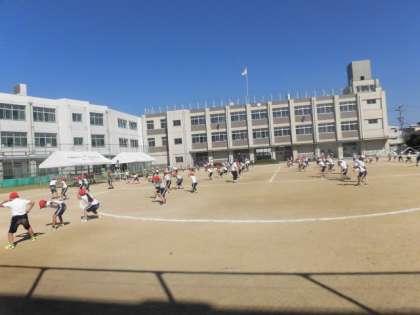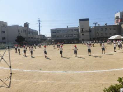 今日は運動場いっぱいを使って、隊形移動の練習をしています。移動をしてからも元気よく演技をしていました!