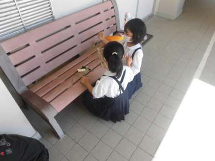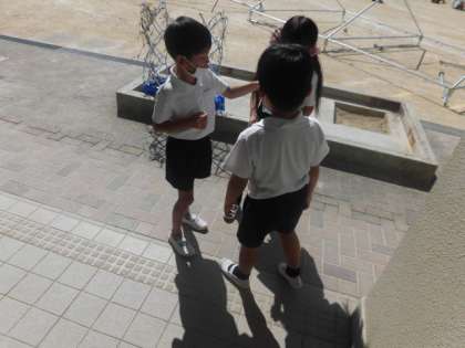 1組では、バッタを飼っています。かわいた土を濡らして、バッタが過ごしやすいようにしたり、えさをあげたりしています。ねこじゃらしもたくさん集めてきました。