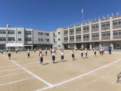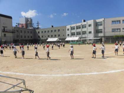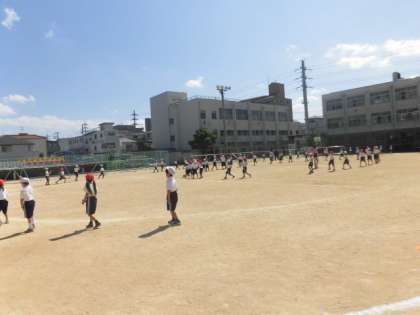 1年生も今日は運動場で隊形の移動を確認したり、移動後の演技を確認したりしています。