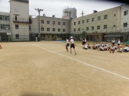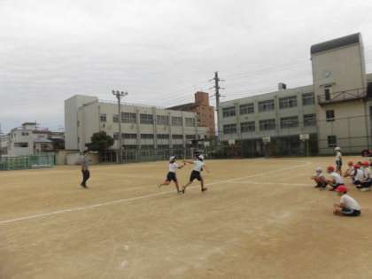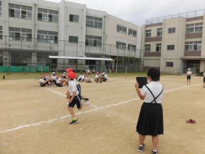 一人1周で6人チームで走ります。運動場をバトンパスをしながら120秒以内を目標に走りました。タブレットに記録して、バトンパスがうまくいっているかを調べます。目標を達成することはできたかな?