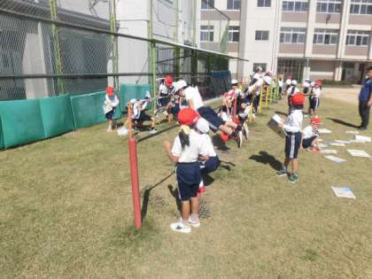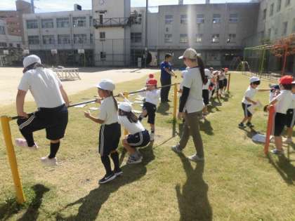 鉄棒をしています。「つばめ」や「ぶたのまるやき」「まえまわり」などの練習をしています。
