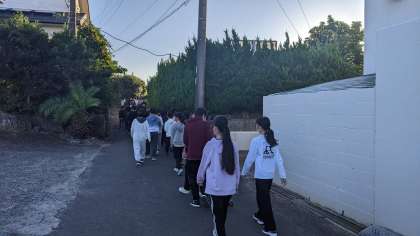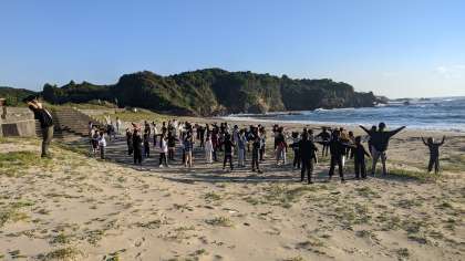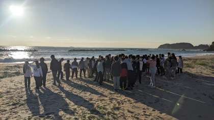 あまり寝られなかった人もいますが、全員、体調バッチリです。海の見える砂浜でのラジオ体操はとても気持ちがいいです!