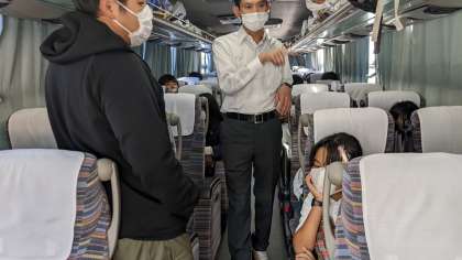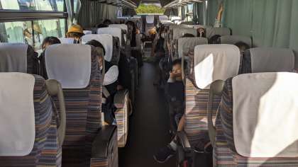 安濃サービスエリアでの休憩を終え、学校に向かって出発しました。学校には少し遅れての到着になりそうです。お疲れで、ぐっすり寝ている人もいます