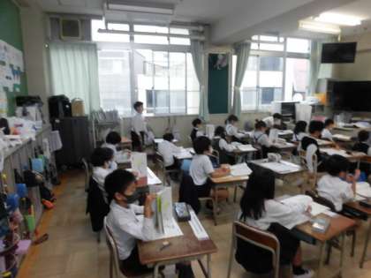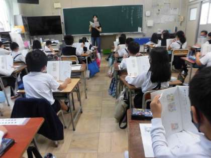 「絵をみてお話を書こう」の学習をしています。くまときつねに分かれて音読をしています。