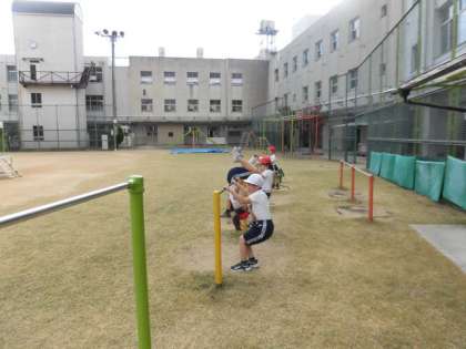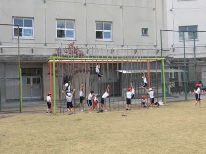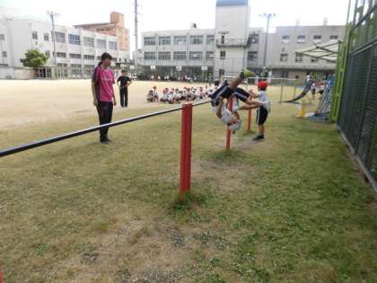 1組は鉄棒で「布団干し」などのテストをしました。終わった人はのぼり棒にチャレンジしています。