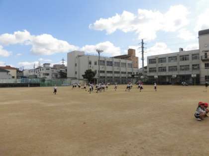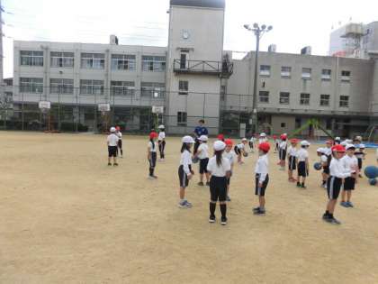 2組は運動場でしっかりと走った後に、ボールを投げたり、とったりする練習をしています。
