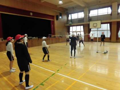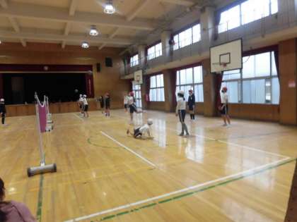 2時間目は2組がソフトバレーボールをしています。難しいけれども、続くと楽しいね!