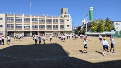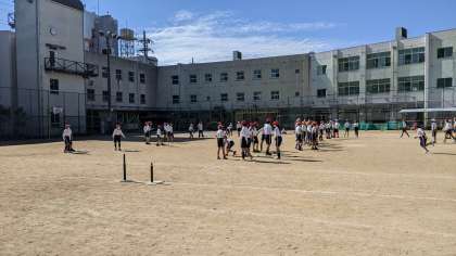 今日は1組と2組の合同で、ティーボールの練習をしています。