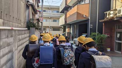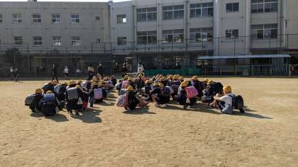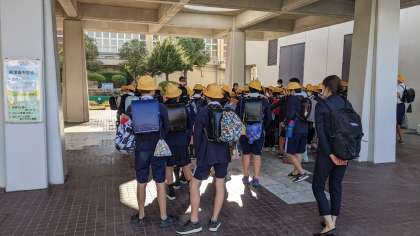 今日は6年生の小中連携の日です。美津島中学校にお世話になります。中学校に着いて、まず学校の大きさにびっくりしています