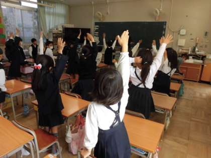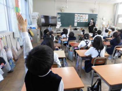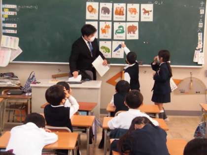 先生の研究授業で、たくさんの先生が見に来ています。以前に習った動物をしっかりと覚えていて、いろいろなゲームで動物の名前を英語でいうことができていました!