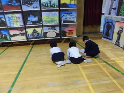 2組が作品展の鑑賞をしています。お姉さんやお兄さんの作品を見て、「すごいな!」と感心をしていました。