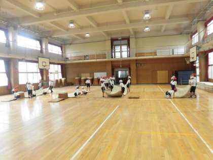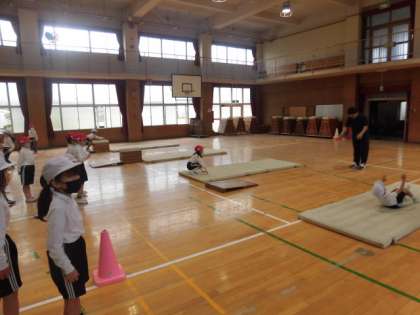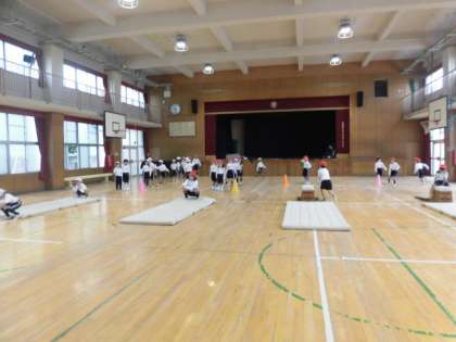 体育館で跳び箱とマット運動をしています。最後の片付けもちゃんと協力してできています!