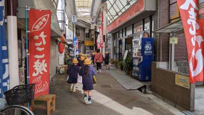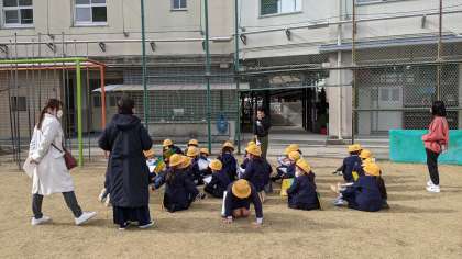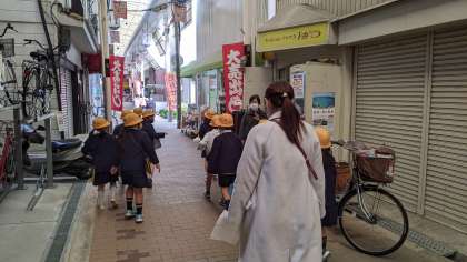 今日は町たんけんに出かけます。班に分かれて、それぞれの班でいろいろな場所を訪問します。