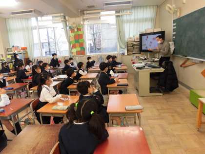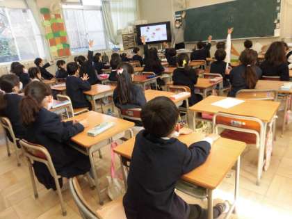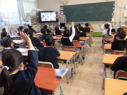 今日はC-NETの先生が来てくれています。テレビにうつった食べ物を見て、みんな大きな声で発音しています!
