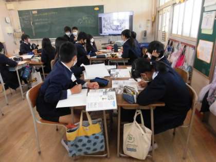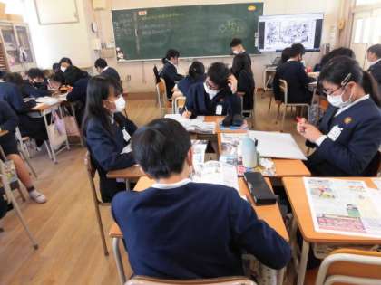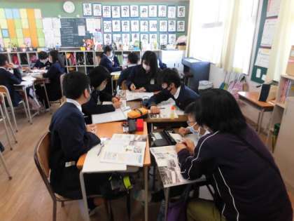 明治時代に日本がどのような国づくりをすすめたかを、絵やグラフから読み取り、班でまとめています。