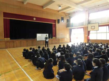 今日は株式会社ライフコーポレーションの方に来ていただいて、食品ロスについてのお話をしていただきました。1日どれくらいのおにぎりが廃棄されているかなど、みんなにも関係のある興味深いお話でした。