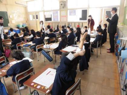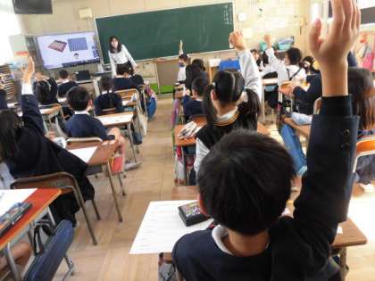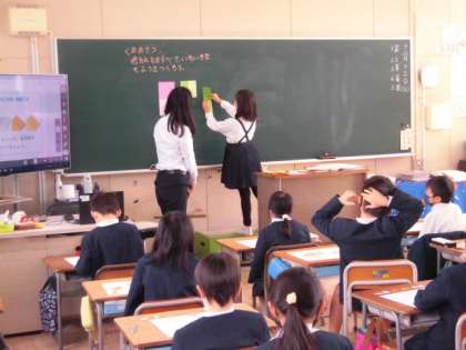 今日は研究授業です。三角形や四角形を組み合わせて、いろいろな図形を作ります。みんなはりきって発表をしてくれました!
