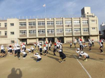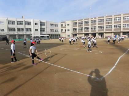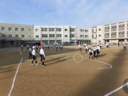 今日は1組と3組が合同で行っています。フラフープドッジをしています。みんな上手に転がしています。