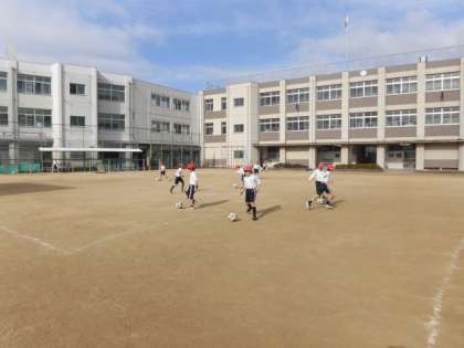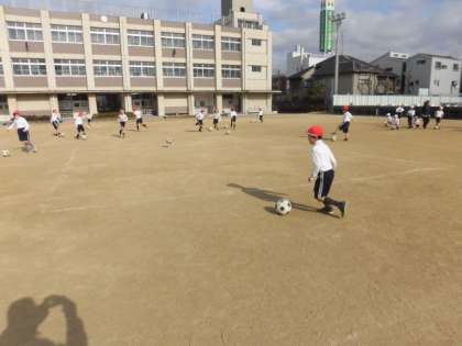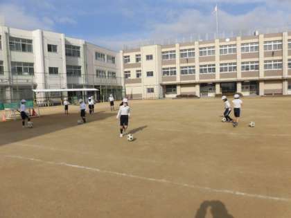 ラインサッカーの練習をしています。ドリブルをして、相手のボールに当てて、陣地から追い出します。ドリブルが随分と上達してきている人がいますね!