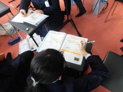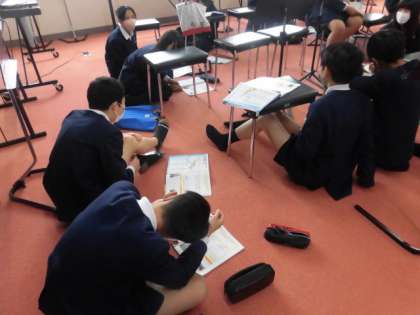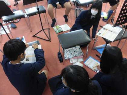 「言葉と旋律の美しさを感じ取りながら、日本の歌を味わいましょう」で、わいわいとグループで話しています。