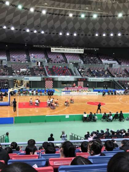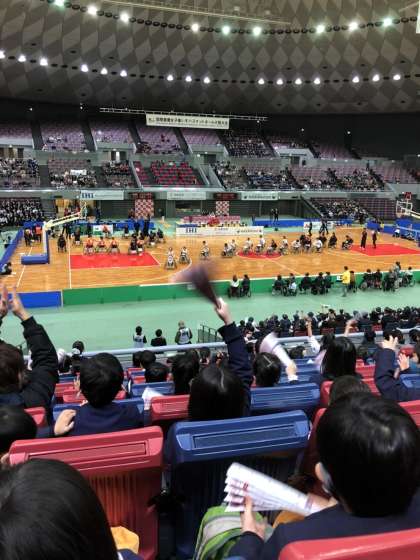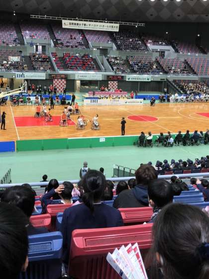 今日は3年生は中央体育館に車イスバスケットボールの観戦に行きました。
