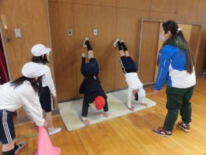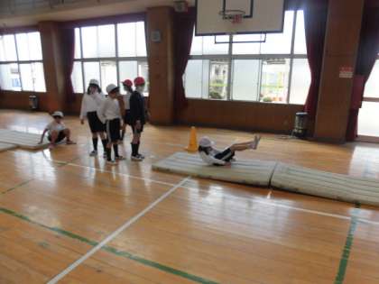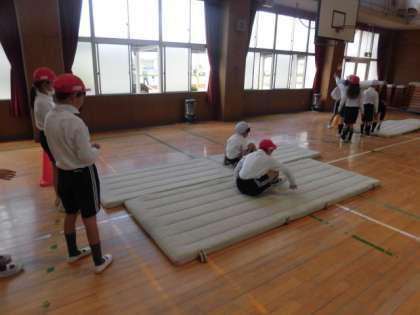 今日は体育館でマット運動をしています。グループで順番に回って、いろいろな運動をします。