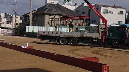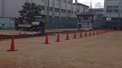 いよいよ校舎の新築工事が始まります。まずはプールの解体・撤去のために「工事エリアを設定しているところです。工事中は運動場が狭くなりますが、子供たちは元気に遊んでいます。