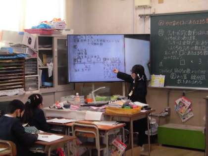 今日は□を使った式について考えました。多くの先生が見守る中、積極的に意見をたくさん発表してくれました。